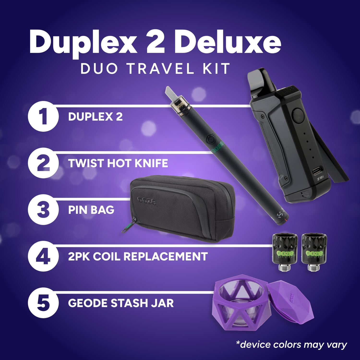 This is it, the ultimate Duplex 2 go bag! You’ve got the 3-in-1 (510 carts, dab bucket, dab straw) Duplex 2 device, the Twist Hot Knife that also works with 510 carts, a 2pk of replacement atomizers, a stash jar for wax, and a smell proof pouch to keep it all organized.